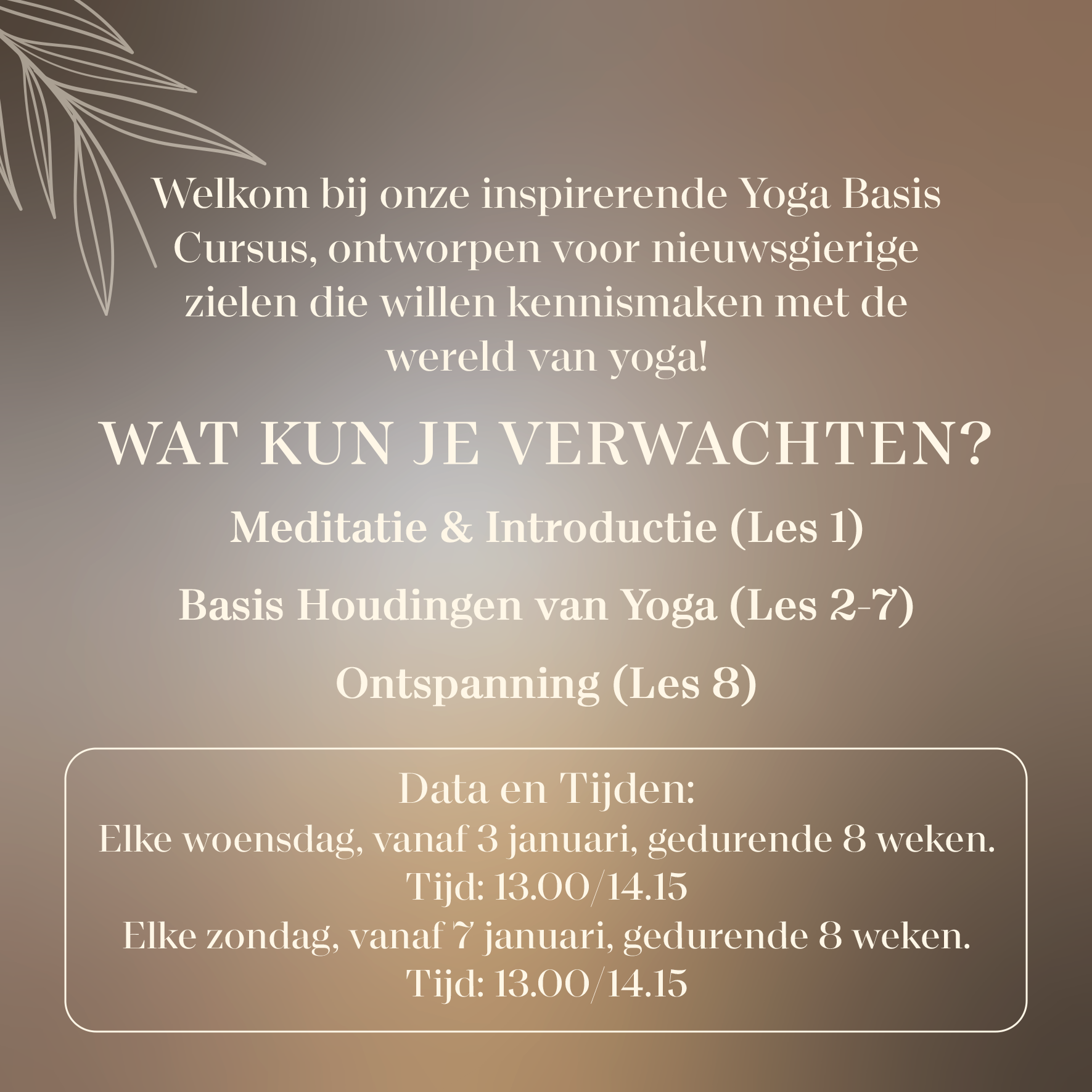 Basis Houdingen van Yoga (Les 2-7): Stap voor stap leer je essentiële yogahoudingen, met nadruk op uitlijning, ademhaling en bewustzijn. Ontspanning (Les 8): Sluit elke sessie af met diepe ontspanning, waardoor je de volledige voordelen van yoga kunt ervaren. Andere Hoogtepunten: Synchroon (gelijktijdig)Werken met Houdingen en Adem: Ontdek de kracht van synchronisatie tussen houdingen en ademhaling voor een vloeiende yogabeleving. Ademhalingstechnieken, Flow Sequenties, Reflectie & Meer! Professionele Begeleiding: Fatima begeleid je zorgvuldig door deze ontdekkingsreis. Praktische Informatie: Data en Tijden: Elke woensdag, vanaf 3 januari, gedurende 8 weken. Tijd: 13.00/14.15 Elke zondag, vanaf 7 januari, gedurende 8 weken. Tijd: 13.00/14.15 Benodigdheden: Comfortabele kleding, yoga-mat (indien mogelijk)